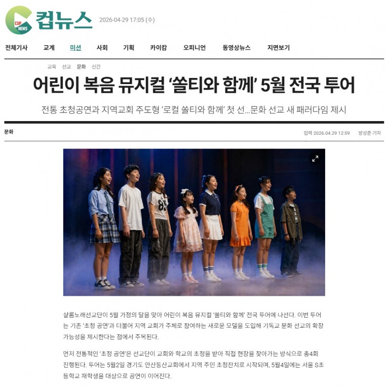 [기사] 어린이 복음 뮤지컬 ‘쏠티와 함께’ 5월 전국 투어(크리스챤연합신문 컵뉴스)