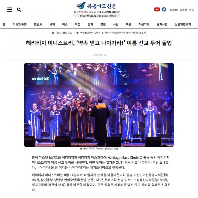 뮤직타임 [기사] 헤리티지 미니스트리, ‘약속 믿고 나아가라!’ 여름 선교 투어 돌입(복음기도신문)