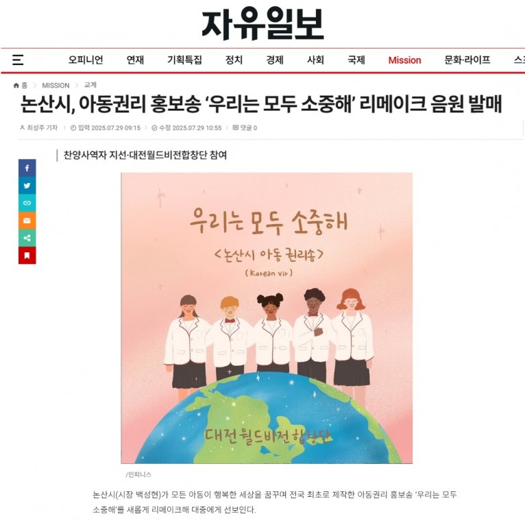 [기사] 논산시, 아동권리 홍보송 ‘우리는 모두 소중해’ 리메이크 음원 발매(자유일보)