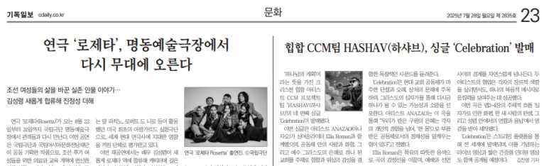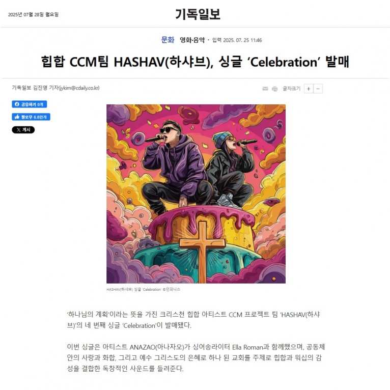 [기사] 힙합 CCM팀 HASHAV(하샤브), 싱글 'Celebration' 발매(기독일보)