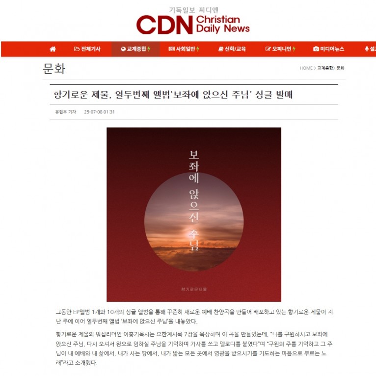 [기사] 향기로운 제물, 열두번째 앨범 ‘보좌에 앉으신 주님’ 싱글 발매(기독일보 씨디엔)