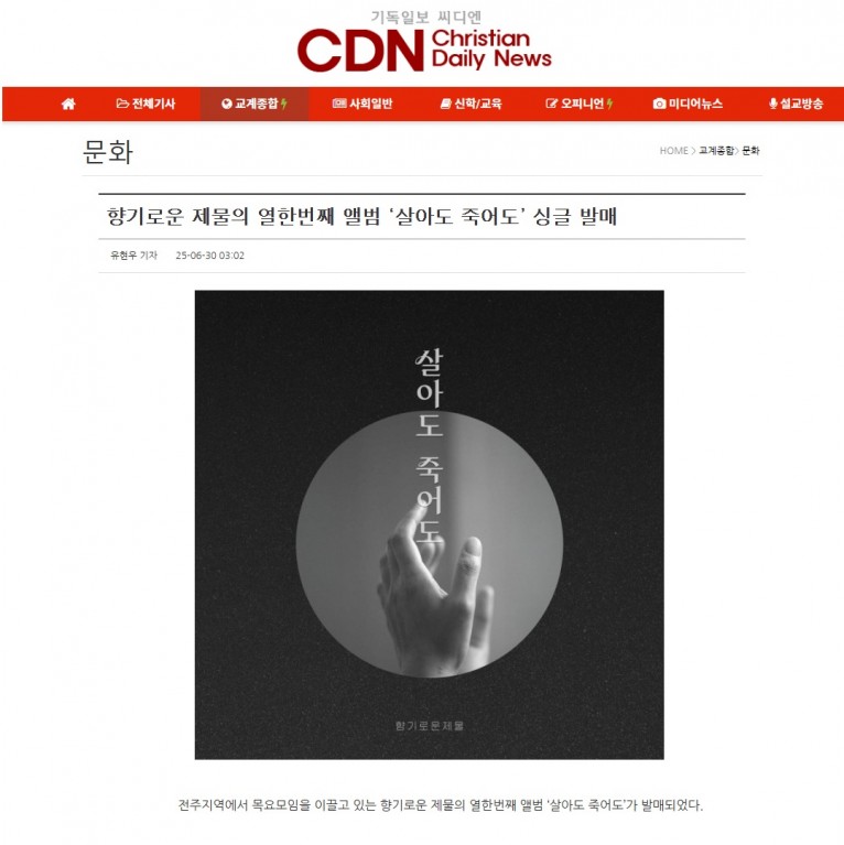[기사] 향기로운 제물의 열한번째 앨범 ‘살아도 죽어도’ 싱글 발매(기독일보 씨디엔)