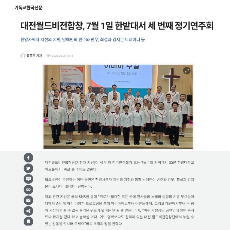 [기사] 대전월드비전합창단, 7월 1일 한밭대서 세 번째 정기연주회(기독교한국신문)