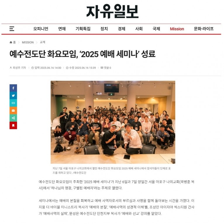 뮤직타임 [기사] 예수전도단 화요모임, ‘2025 예배 세미나’ 성료(자유일보)