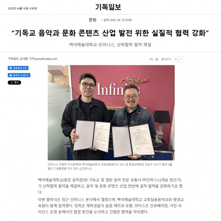 백석예술대학교(총장 윤미란)와 기독교 및 일반 음악 전문 유통사 ㈜인피니스(대표 정선기)가 산학협력 협약을 체결하고, 음악 및 문화 콘텐츠 산업 전반에 걸쳐 협력을 강화하기로 했다.