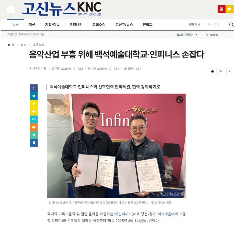 [기사] 음악산업 부흥 위해 백석예술대학교·인피니스 손잡다(고신뉴스 KNC)