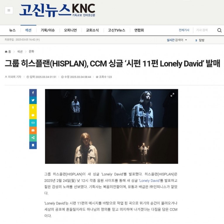 뮤직타임 [기사] 그룹 히스플랜(HISPLAN), CCM 싱글 ‘시편 11편 Lonely David’ 발매(고신뉴스 KNC)