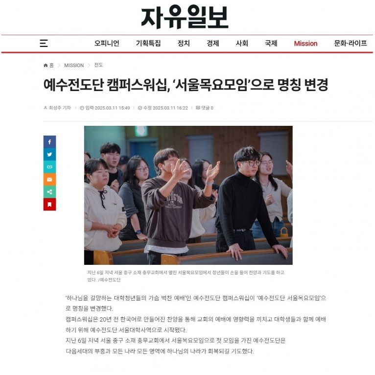 [기사] 예수전도단 캠퍼스워십, ‘서울목요모임’으로 명칭 변경(자유일보)