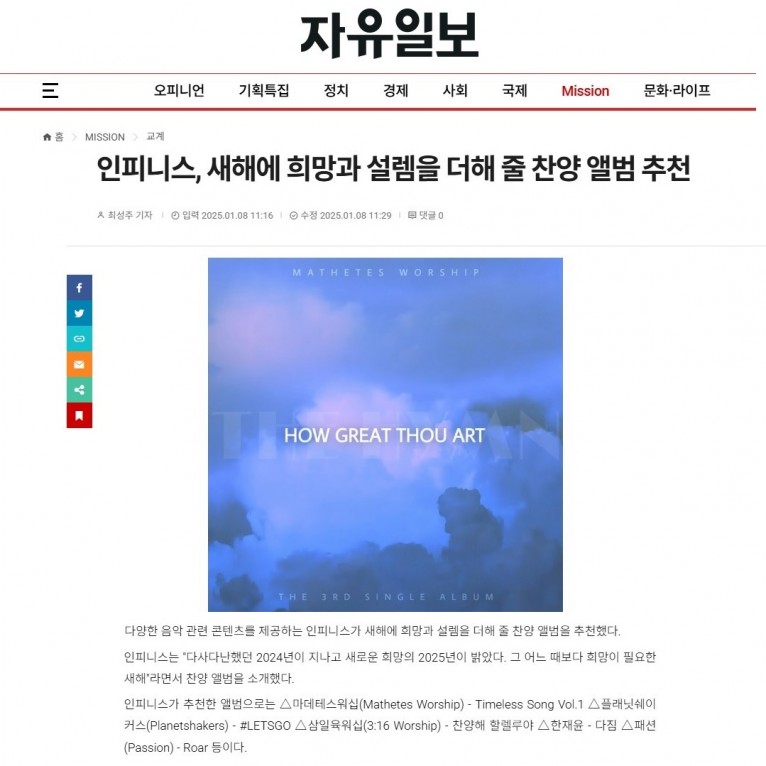 인피니스는 "다사다난했던 2024년이 지나고 새로운 희망의 2025년이 밝았다. 그 어느 때보다 희망이 필요한 새해"라면서 찬양 앨범을 소개했다.