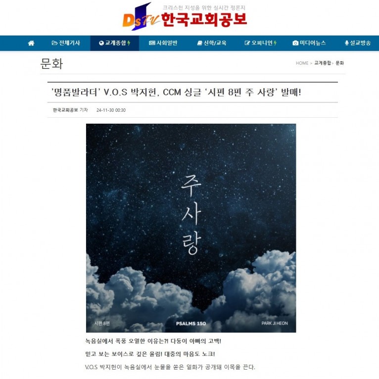 [기사] ’명품발라더’ V.O.S 박지헌, CCM 싱글 ‘시편 8편 주 사랑’ 발매!(한국교회공보)