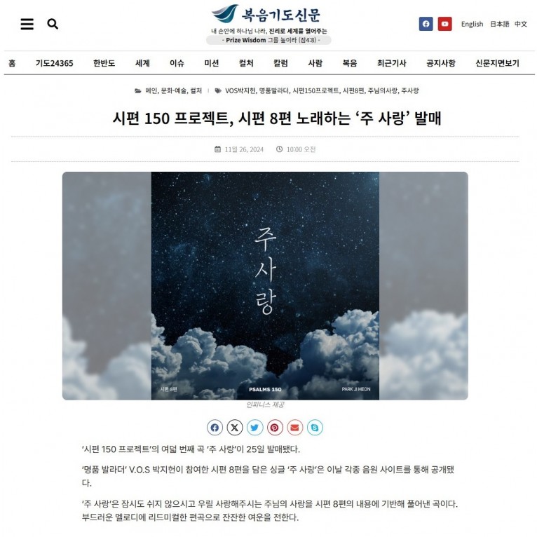 [기사] 시편 150 프로젝트, 시편 8편 노래하는 ‘주 사랑’ 발매(복음기도신문)