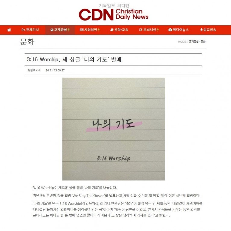 [기사] 3:16 Worship, 새 싱글 ‘나의 기도’ 발매(기독일보 씨디엔)