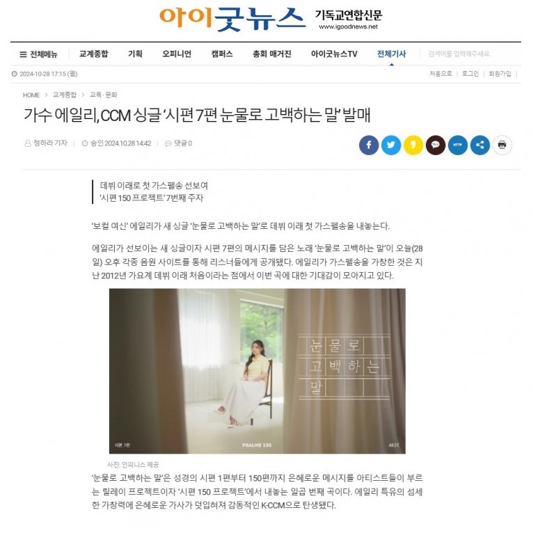 뮤직타임 [기사] 가수 에일리, CCM 싱글 ‘시편 7편 눈물로 고백하는 말’ 발매(기독교연합신문 아이굿뉴스)