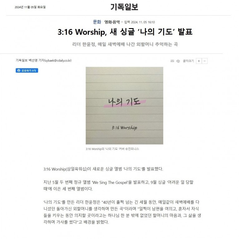 [기사] 3:16 Worship, 새 싱글 ‘나의 기도’ 발표(기독일보)