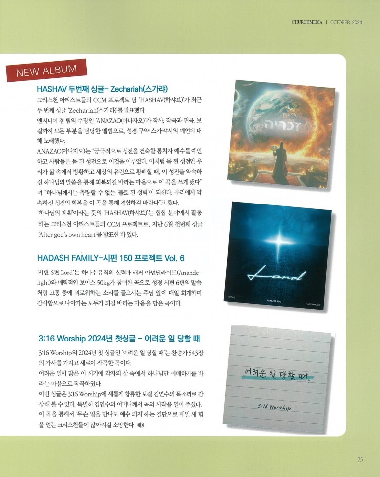 [잡지] New Album_ 3:16 Worship - 어려운 일 당할 때 (싱글) 등 3편(월간 Church Media 2024.10월호)