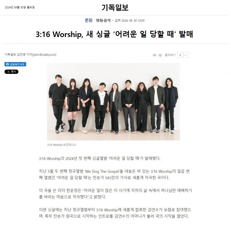 [기사] 3:16 Worship, 새 싱글 ‘어려운 일 당할 때’ 발매(기독일보)