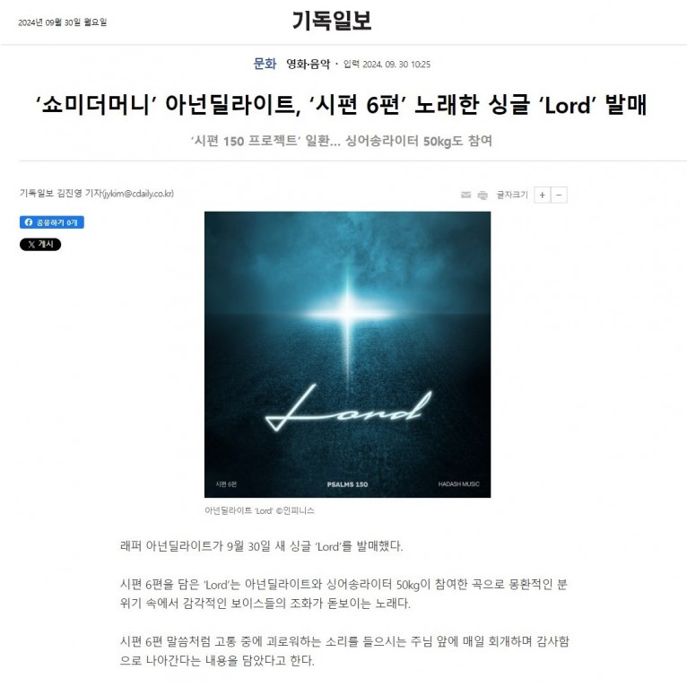 [기사] ‘쇼미더머니’ 아넌딜라이트, ‘시편 6편’ 노래한 싱글 ‘Lord’ 발매(기독일보)