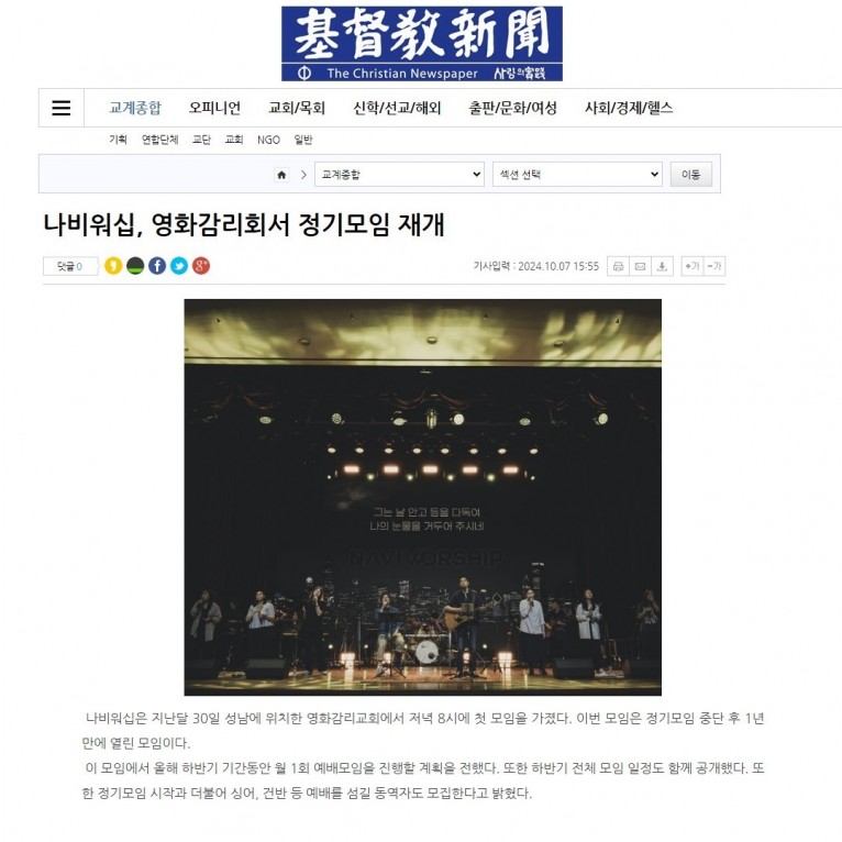 뮤직타임 [기사] 나비워십, 영화감리교회서 정기모임 재개(기독교신문)