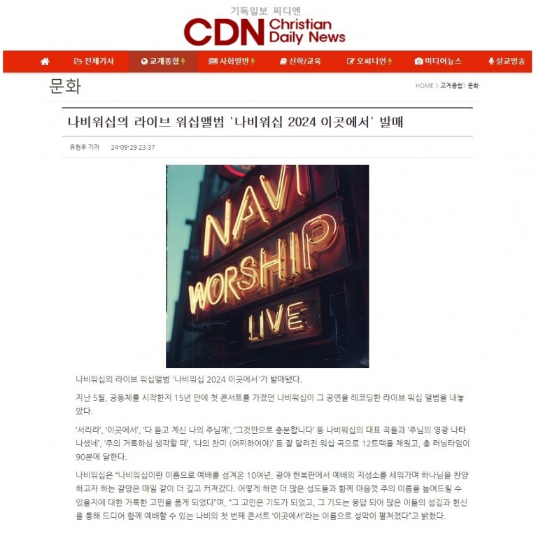 뮤직타임 [기사] 나비워십의 라이브 워십앨범 '나비워십 2024 이곳에서' 발매(기독일보 씨디엔)