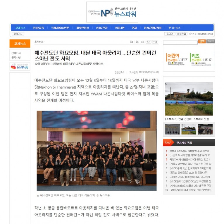 [기사] 예수전도단 화요모임, 내달 태국 아웃리치 ...단순한 컨퍼런스아닌 전도 사역(뉴스파워)