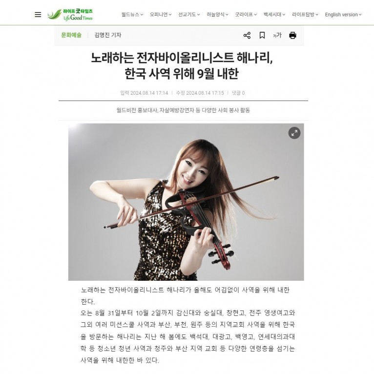 [기사] 노래하는 전자바이올리니스트 해나리, 한국 사역 위해 9월 내한(라이프굿타임즈)
