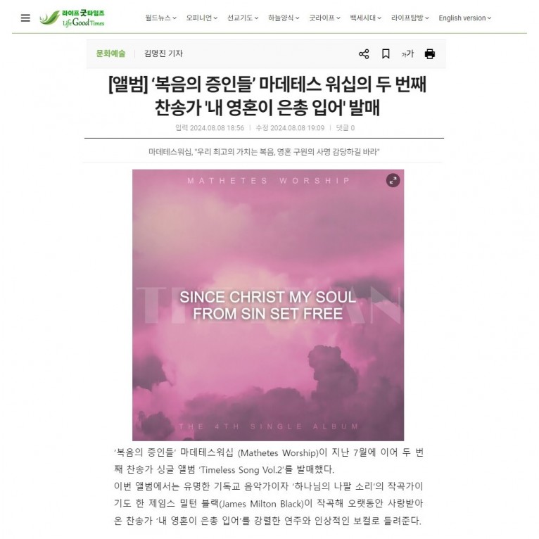 [기사] ‘복음의 증인들’ 마데테스 워십의 두 번째 찬송가 '내 영혼이 은총 입어' 발매(라이프굿타임즈)