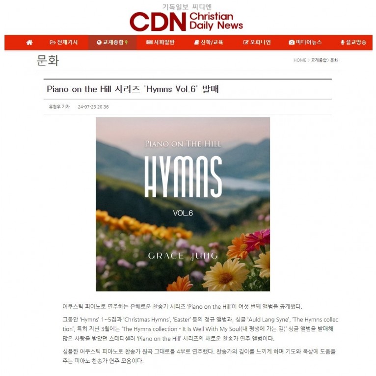 [기사] Piano on the Hill 시리즈 'Hymns Vol.6' 발매(기독일보 씨디엔)