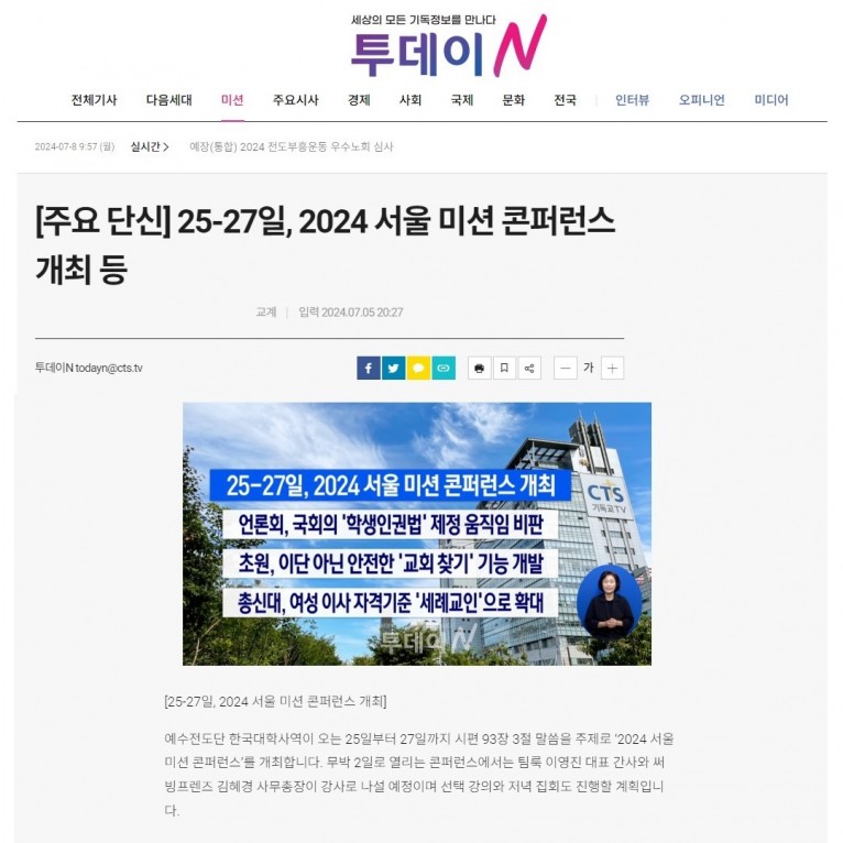 [보도] 25-27일, 2024 서울 미션 콘퍼런스 개최(기독교텔레비전 CTS)