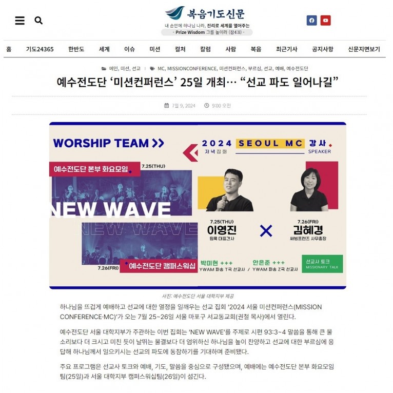 [기사] 예수전도단 ‘미션컨퍼런스’ 25일 개최… “선교 파도 일어나길”(복음기도신문)