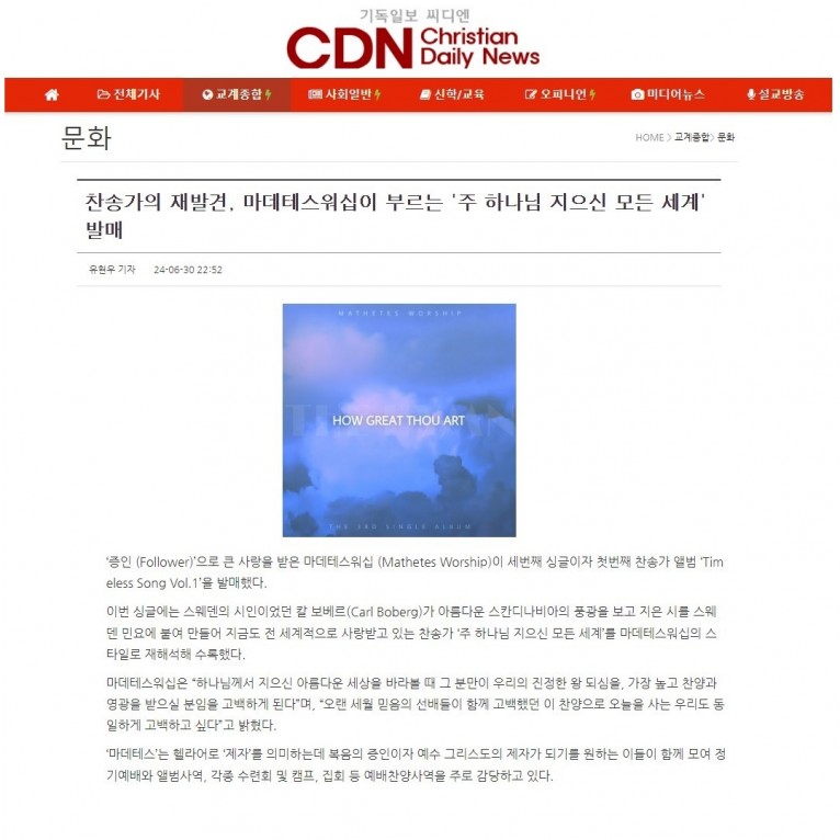 [기사] 찬송가의 재발견, 마데테스워십이 부르는 '주 하나님 지으신 모든 세계' 발매(기독일보 씨디엔)