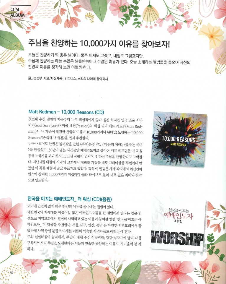 첫번째 추천 앨범의 제목부터 너무 직설적이지 않나 싶긴 하지만 영국 소울 서바이버(Soul Survivor)와 미국 패션(Passion)의 워십리더 매트 레드먼(Matt Redman)이 ‘내 가슴이 발견한 찬양의 이유가 10,000가지나 된다’고 노래하는 ‘10,000 Reasons’(송축해 내 영혼)을 먼저 추천한다.