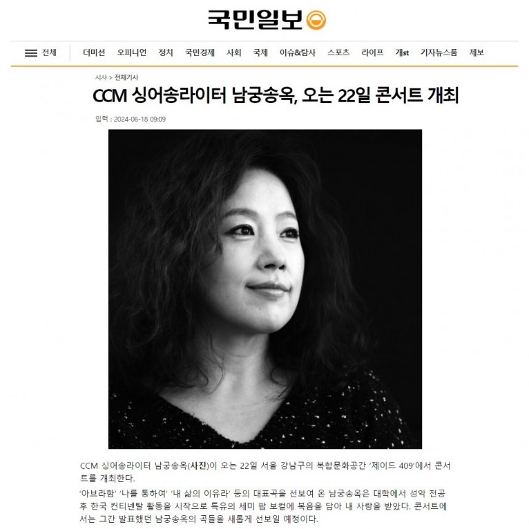 [기사] CCM 싱어송라이터 남궁송옥, 오는 22일 콘서트 개최(국민일보)