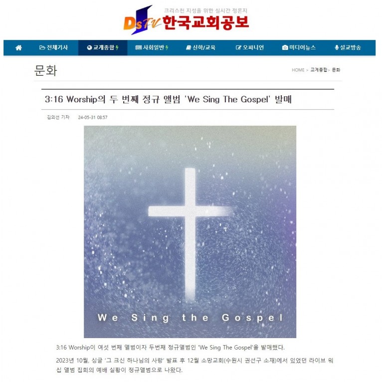 [기사] 3:16 Worship의 두 번째 정규 앨범 'We Sing The Gospel' 발매(한국교회공보)