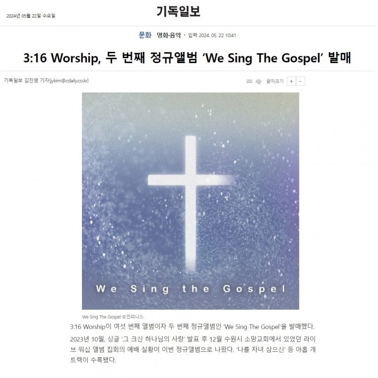 뮤직타임 [기사] 3:16 Worship, 두 번째 정규앨범 ‘We Sing The Gospel’ 발매(기독일보)