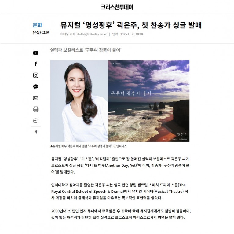 뮤직타임 [기사] 뮤지컬 ‘명성황후’ 곽은주, 첫 찬송가 싱글 발매(크리스천투데이)