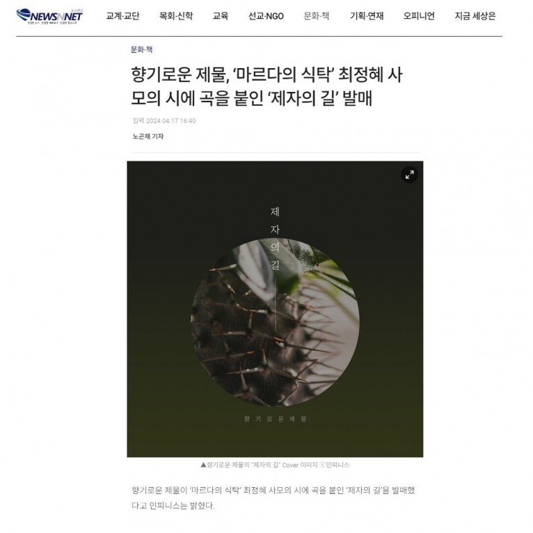 [기사] 향기로운 제물, ‘마르다의 식탁’ 최정혜 사모의 시에 곡을 붙인 ‘제자의 길’ 발매(뉴스앤넷)