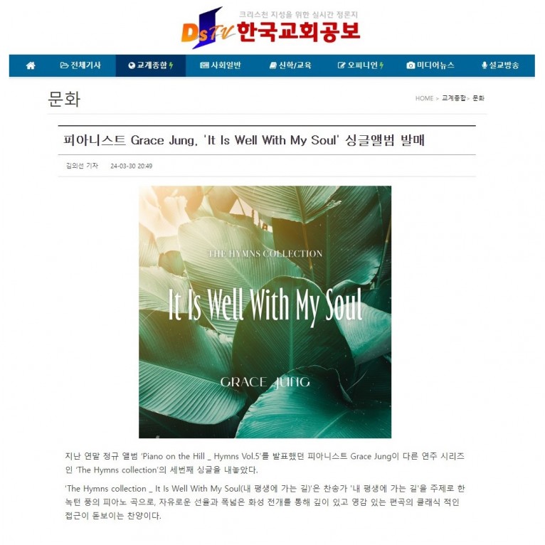 뮤직타임 [기사] 피아니스트 Grace Jung, 'It Is Well With My Soul' 싱글앨범 발매(한국교회공보)