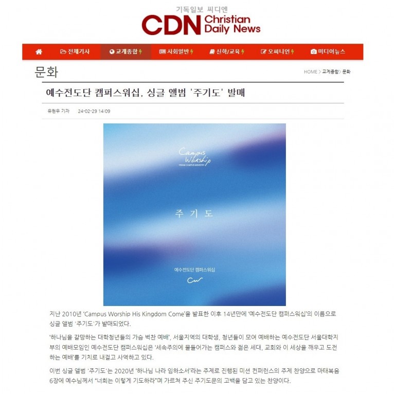 [기사] 예수전도단 캠퍼스워십, 싱글 앨범 '주기도' 발매(기독일보 씨디엔)