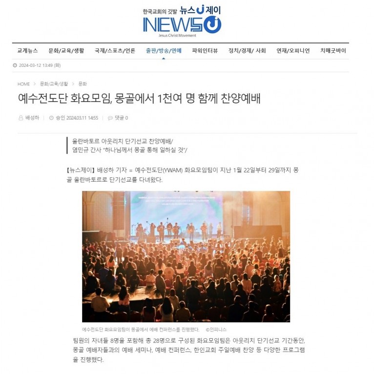 [기사_인터뷰] 예수전도단 화요모임, 몽골에서 1천여 명 함께 찬양예배(뉴스제이)