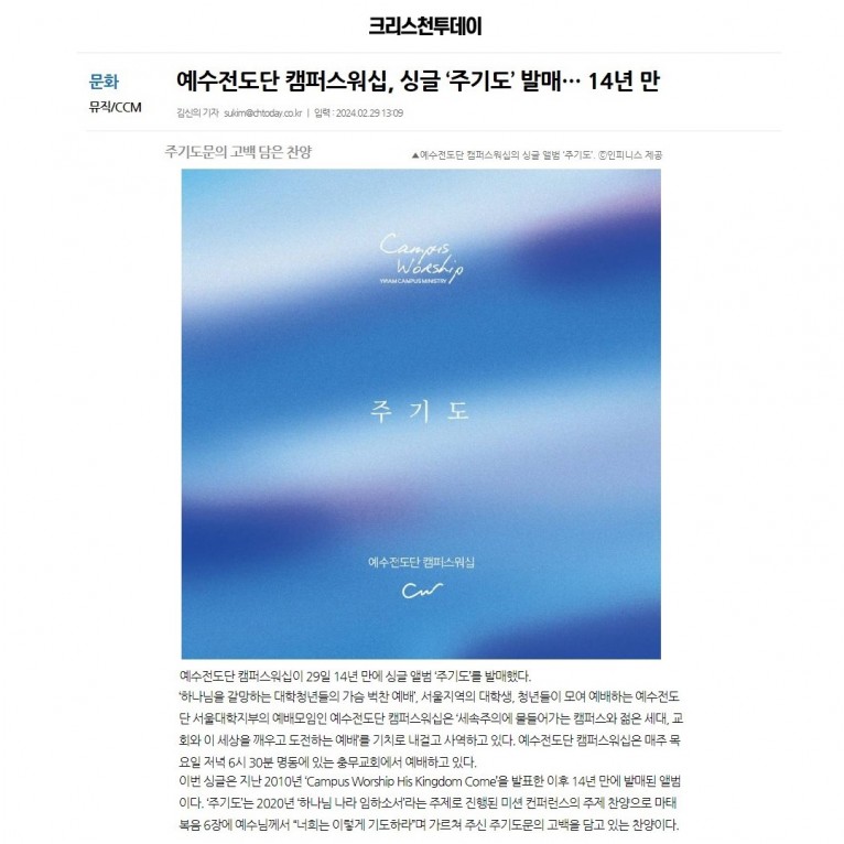 [기사] 예수전도단 캠퍼스워십, 싱글 ‘주기도’ 발매… 14년 만(크리스천투데이)
