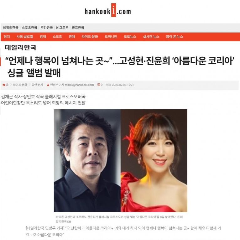 [기사] “언제나 행복이 넘쳐나는 곳~”...고성현·진윤희 ‘아름다운 코리아’ 싱글앨범 발매 (데일리한국)