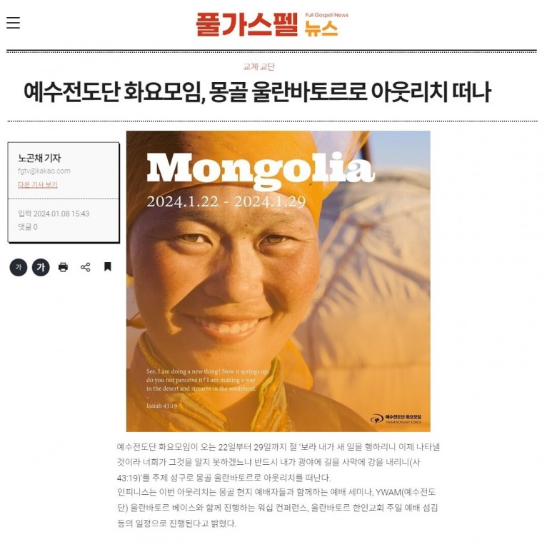 뮤직타임 [기사] 예수전도단 화요모임, 몽골 울란바토르로 아웃리치 떠나(풀가스펠뉴스)