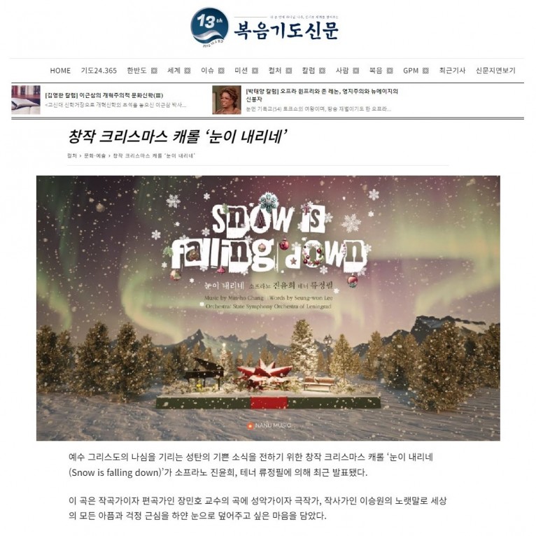 [기사] 창작 크리스마스 캐롤 ‘눈이 내리네’(복음기도신문)