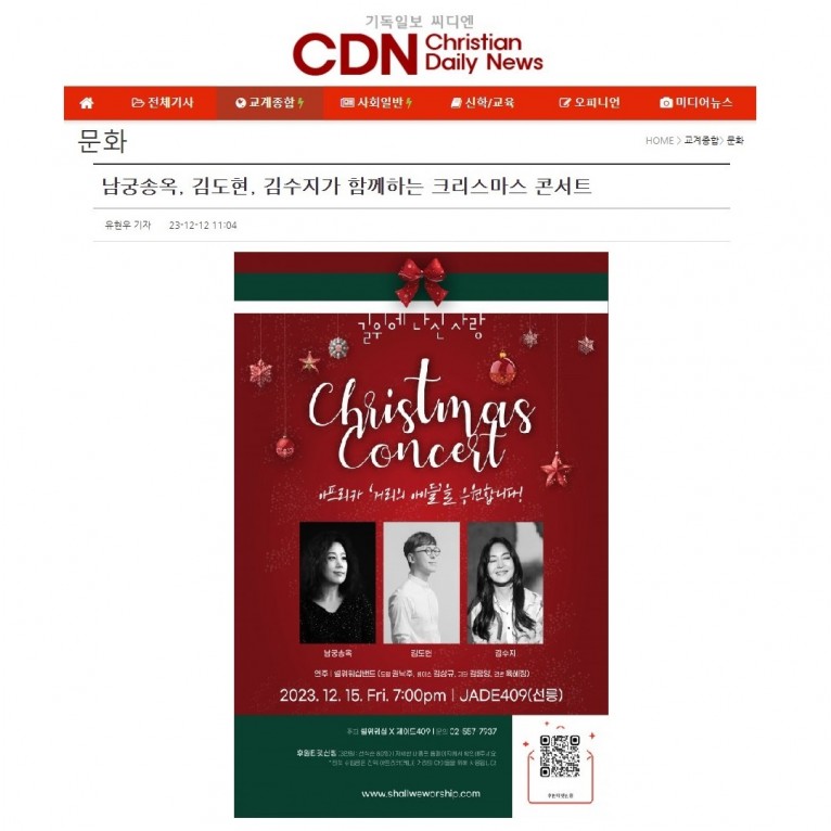 뮤직타임 [기사] 남궁송옥, 김도현, 김수지가 함께하는 크리스마스 콘서트(기독일보 씨디엔)