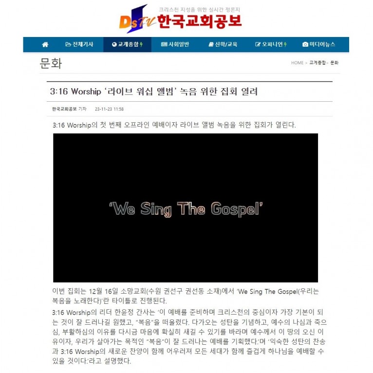[기사] 3:16 Worship ‘라이브 워십 앨범’ 녹음 위한 집회 열려 (한국교회공보)