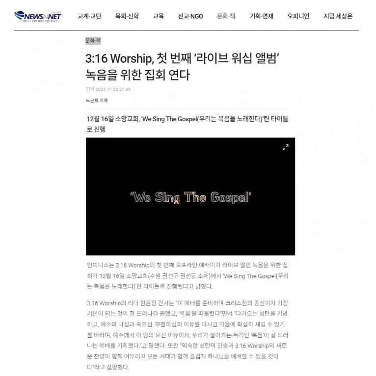 [기사] 3:16 Worship, 첫 번째 ‘라이브 워십 앨범’ 녹음을 위한 집회 연다 (뉴스앤넷)