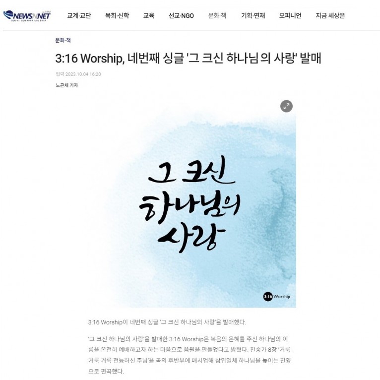 [기사] 3:16 Worship, 네번째 싱글 '그 크신 하나님의 사랑' 발매(뉴스앤넷)