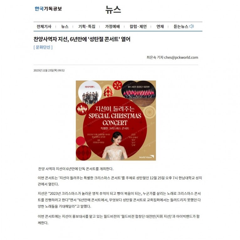 [기사] 찬양사역자 지선, 6년만에 '성탄절 콘서트' 열어(한국기독공보)