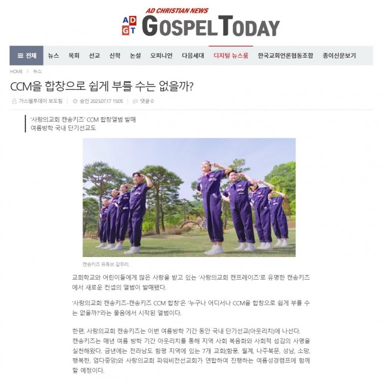 뮤직타임 [기사] ‘사랑의교회 캔송키즈’ CCM 합창앨범 발매, 여름방학 국내 단기선교도(가스펠투데이)