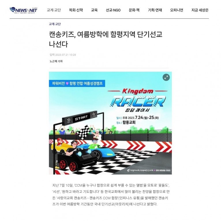 [기사] 캔송키즈, 여름방학에 함평지역 단기선교 나선다(뉴스앤넷)